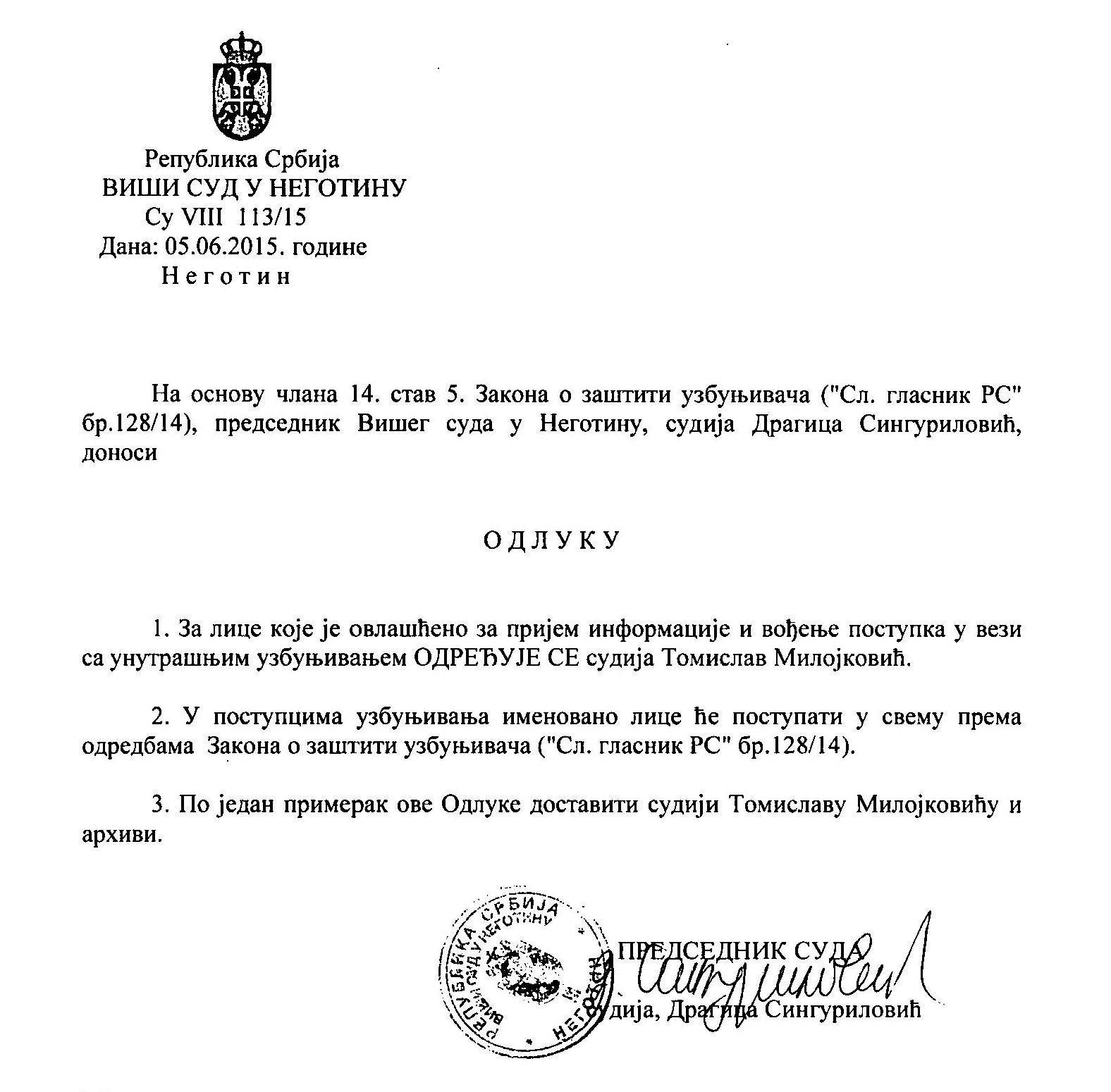 Председник Вишег суда у Неготину, судија Драгица Сингуриловић на основу члана 14 став 5 и члана 10 Закона о заштити узбуњивача ("Службени гласник РС" број 128/14), члана 52 став 1 Закона о уређењу судова и члана 6 Судског пословника, дана 05.06.2015.године доноси Одлуку о лицу овлашћеном за пријем информација о узбуњивању - коју можете преузети у јпег формату -овде